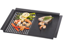 So we did a little digging and found the Dual Grill Pan, (pictured right) that prevents anything from falling into the flames. The pan lays flat across the top of any grill, so there’s no chance of losing food. The perforated side of the pan is perfect for cooking vegetables and shellfish, while the ridged side is made for big cuts of meat, like steak or chicken. It’s also nonstick, which makes for easy clean up. That something you don’t hear often when you’re grilling.
