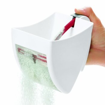 What sets this apart is its curved shape allows you to scoop flour right out of the bag and the trigger sifting mechanism let’s you scoop and sift with one hand. And the mesh opening prevents messes, so you can even use it to add finishing touches, like powdered sugar for the tops of cakes, right at the table.