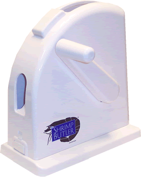Just put each into the machine tail first, pull the lever, and they come out not only de-veined, but also butterflied! Rinse under water and prepare as you like. The Shrimp Butler is key to an easier clambake.