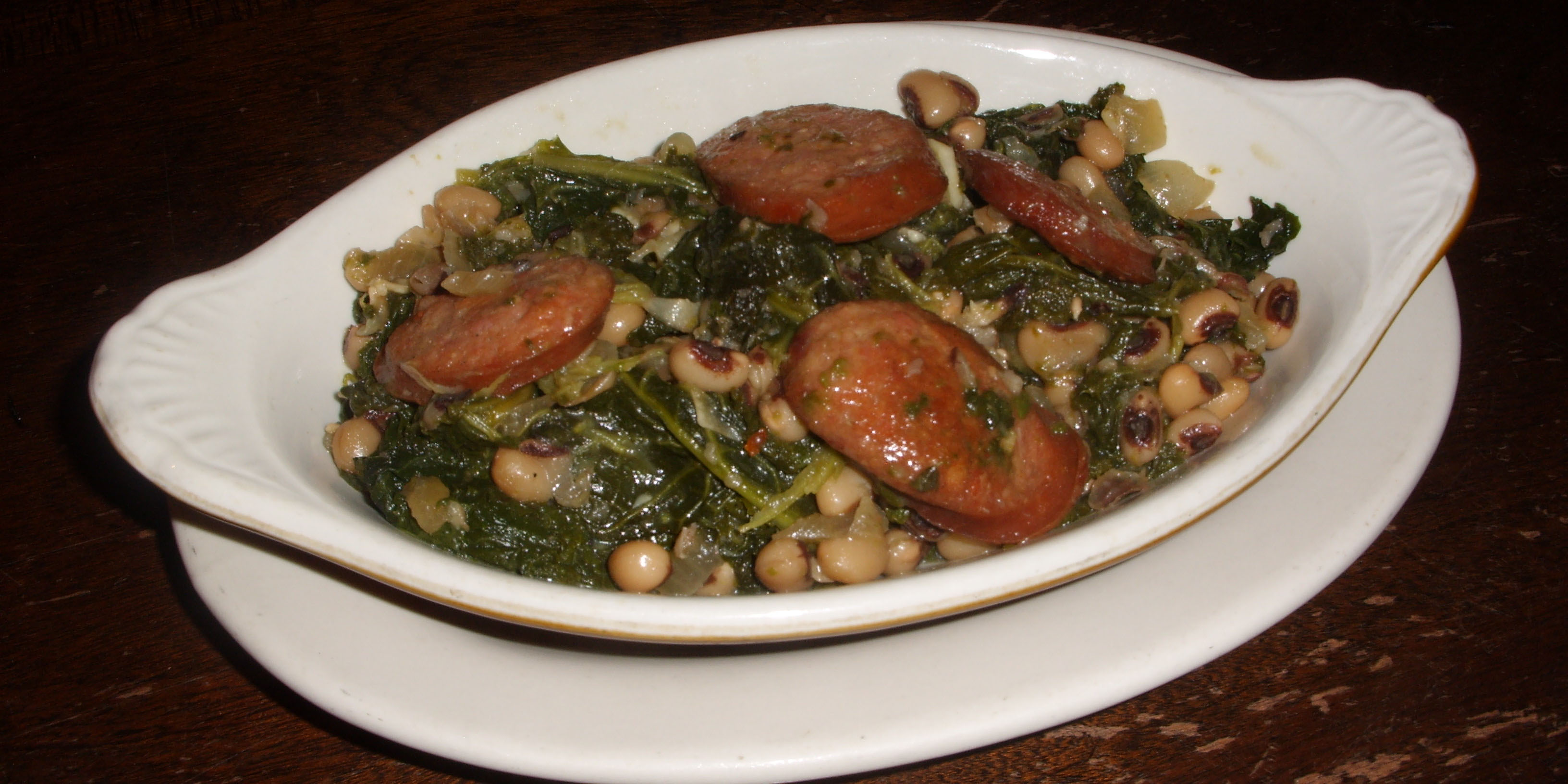 This is as easy as it is good. The hardest part of this recipe is cooking the black-eyed peas. As the beans are cooking, or the cans are being opened, thoroughly clean the kale and take out all of the stems. Blanch the kale in really salty boiling water until it has no bite and strain well. In a Large pan, brown the sausage slices well. Add to the sausage the onions and garlic and cook until brown and tender. Add to this the peas and kale with a half cup of the bean liquid. Season and reduce together, about five minutes. You can leave this loose and eat it like a soup or let it thicken and serve as a side to the holiday meal.