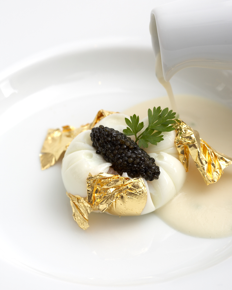 4) To serve Place each egg in a bowl. Top with a quenelle of black caviar and pour the cauliflower puree around the egg. Garnish with chives and gold leaf.