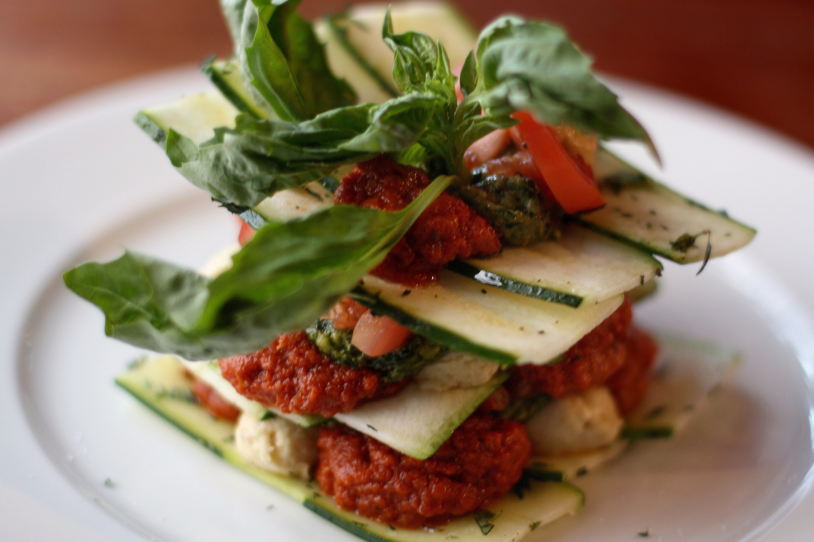 pasta-free version, layered with zucchini, tomatoes and pistachio