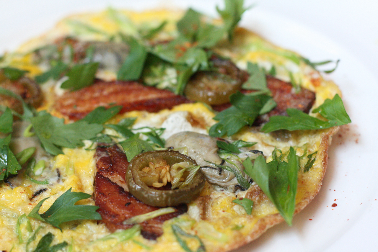 Heat a medium non-stick pan over medium heat and cook bacon until golden and brown. Flip the bacon and turn off heat. Add the gently whipped eggs, salt, pickled jalapeños, and shucked oysters to the pan. Sprinkle spring onions on top. Place pan under the broiler for 2 minutes until just cooked.